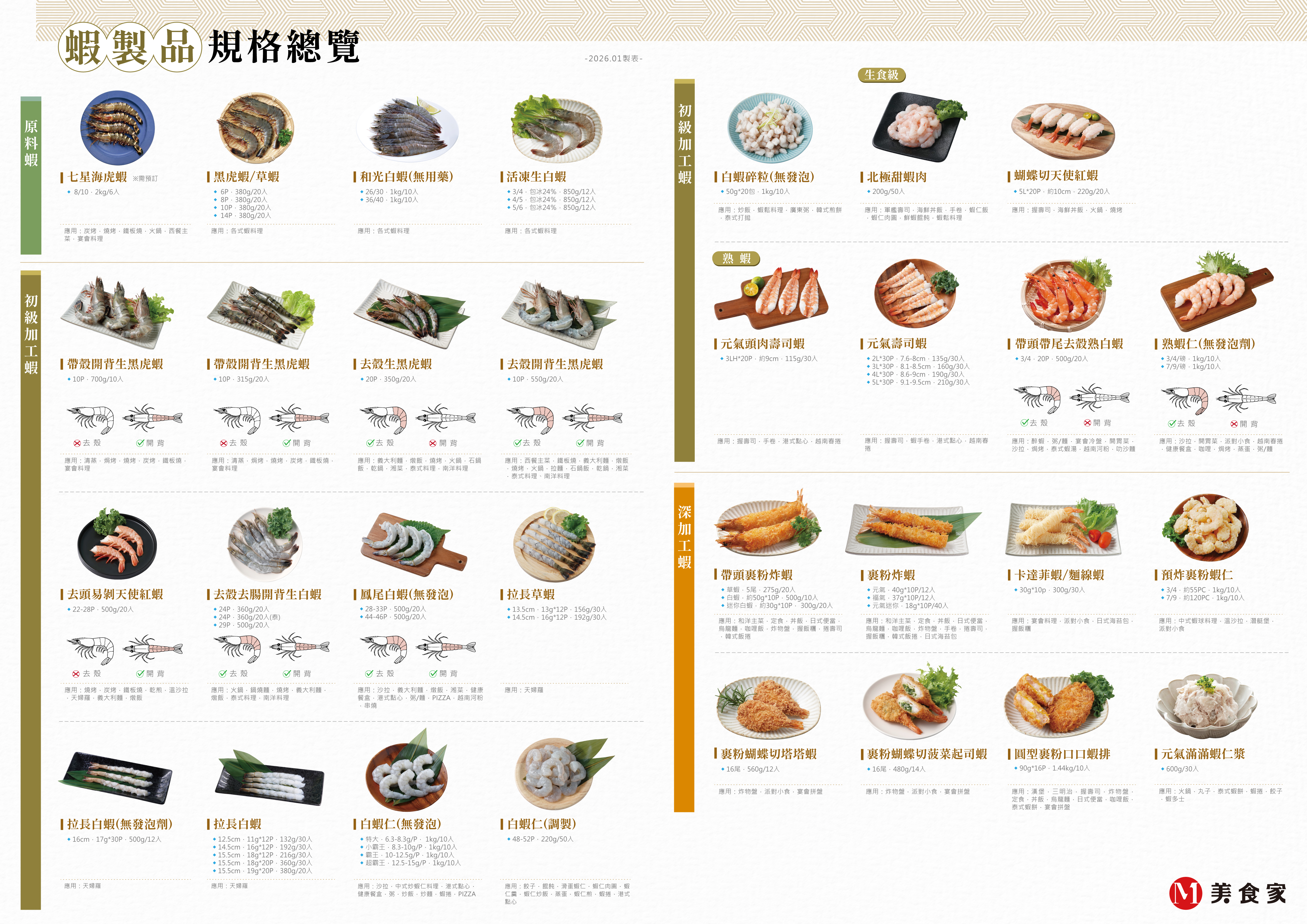 蝦製品規格總覽Shrimp Products瀏覽內容下載型錄精選水產製品Featured Seafood Products瀏覽內容下載型錄日式料理食材目錄Japanese Food Ingredients瀏覽內容下載型錄西餐義式食材目錄Western & Italian Food Ingredients瀏覽內容下載型錄載入完畢沒有內容載入更多